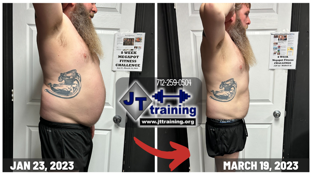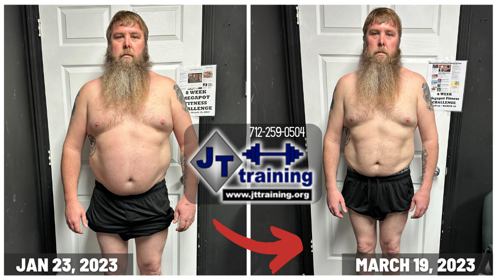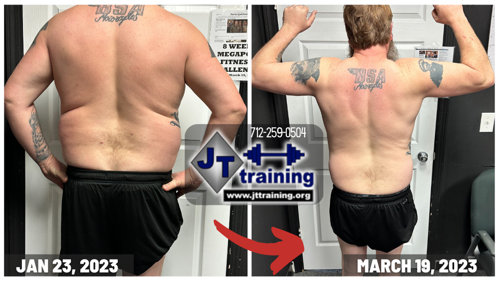 "JT Training is a great place to get in SHAPE! They have awesome trainer's who will help motivate you and make it fun to be there. The program assists with all aspects of reaching your goals. They even help you learn what to eat and what not to eat to be successful ('fueling your body to your goals'). Don't know what you're doing in the the gym? That's ok too. They plan your workout everyday and all you have to do is show up and the trainer takes care of everything! The trainers not only motivate you the also teach you perfect form and proper technique. It's perfect for people of all fitness levels, if you aren't able to perform an exercise or if its to easy they will modify it for your fitness level, special condition or injury. Since joining JT Training I feel so much better! I'm not going to lie the first few weeks were tough but I kept going and it got a little easier each day. I have more work to do to get to where I want to be but with the help of Jay and Bryan I believe I'll get there. I recently did an 8 week challenge where I lost an amazing 42 pounds!"