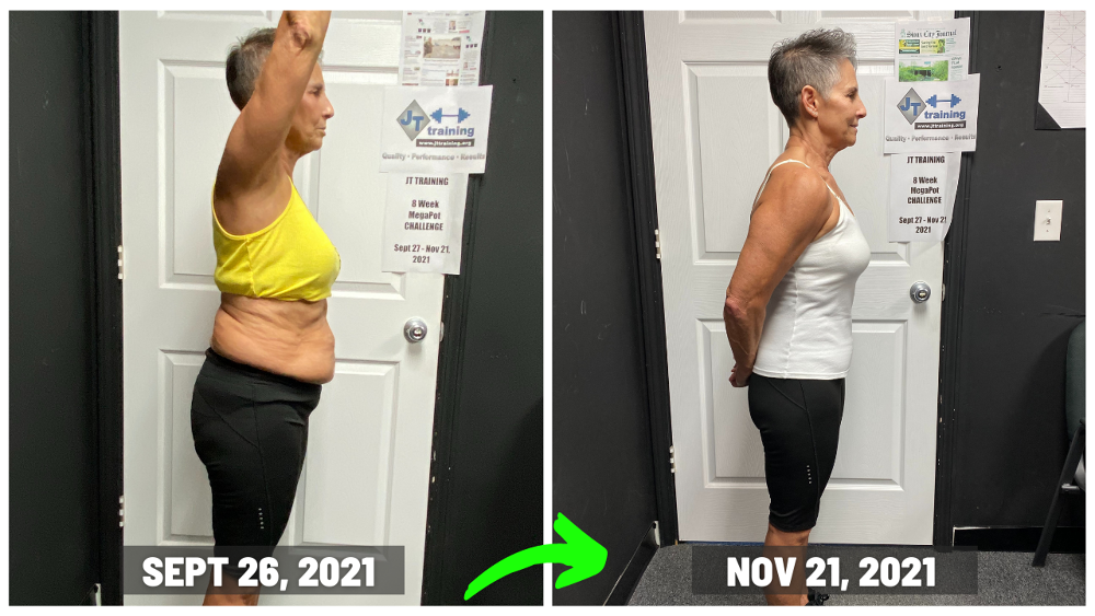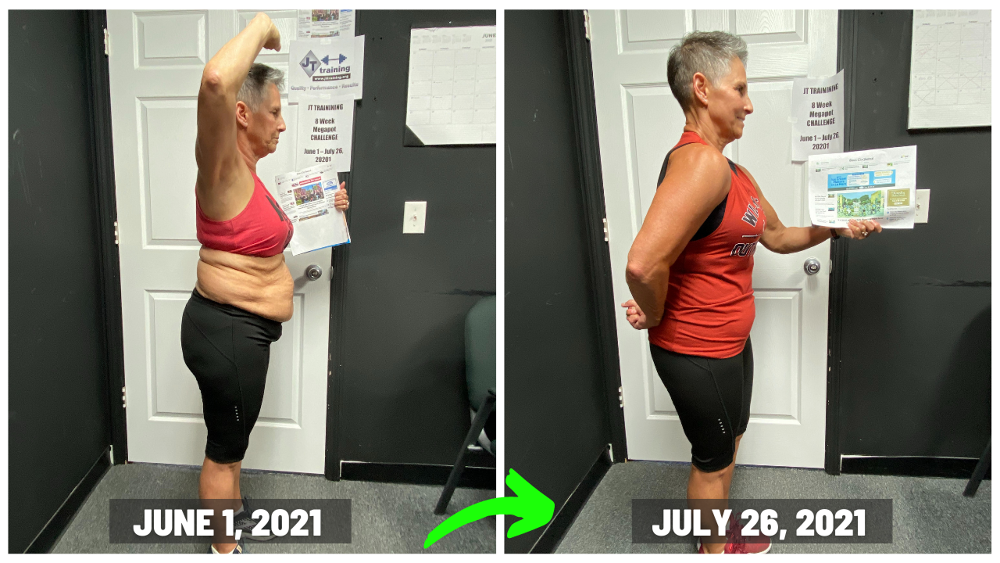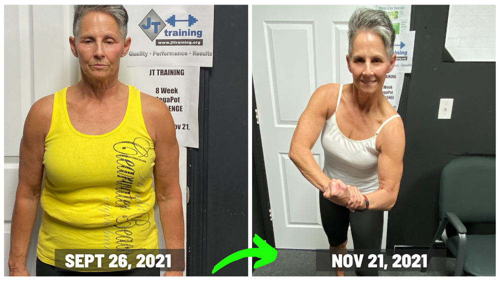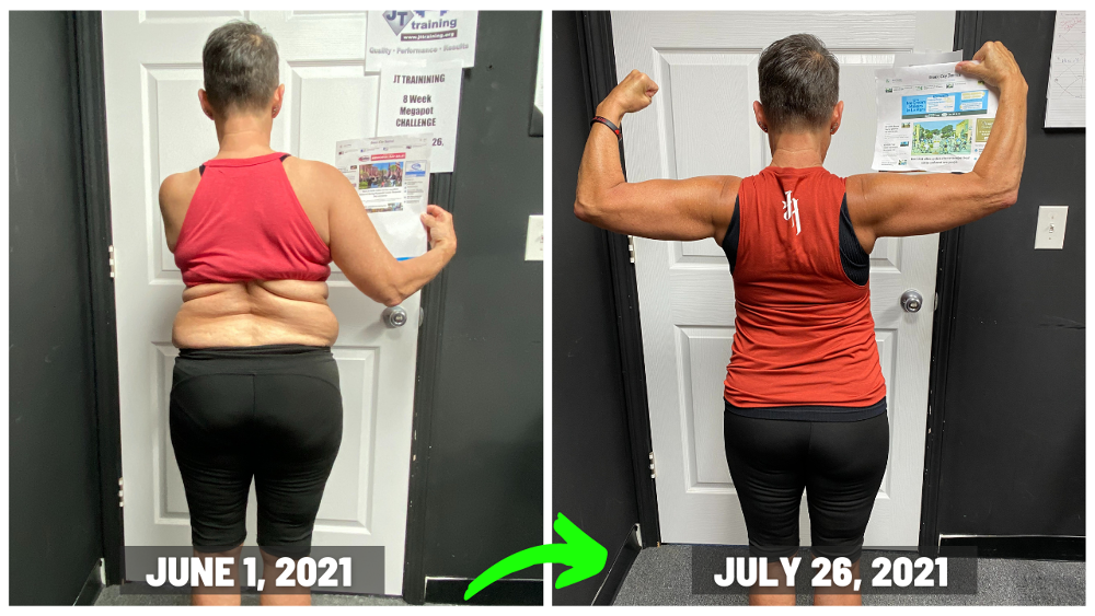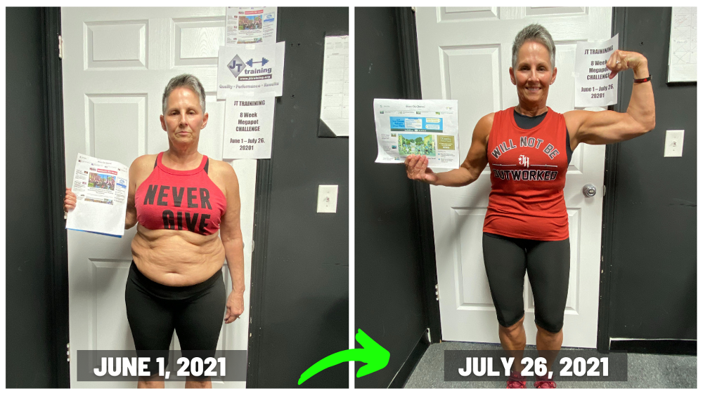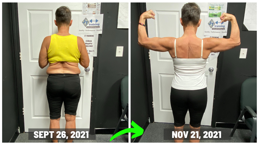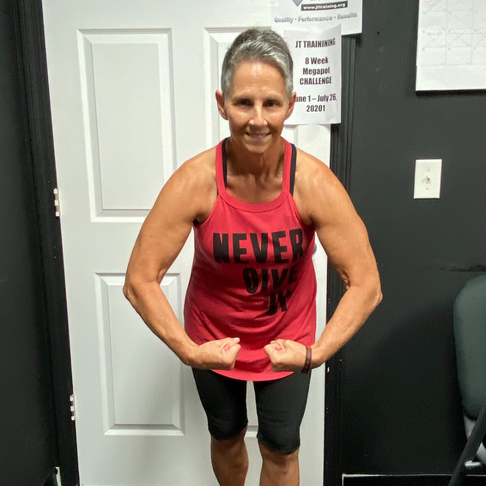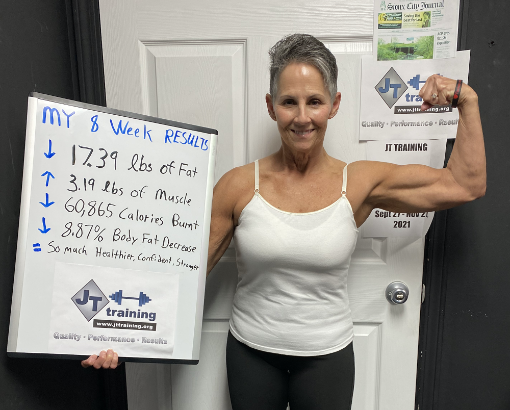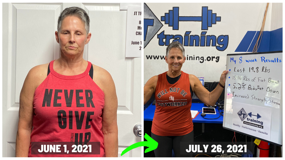 "My results at JT training were exactly what I wanted…close to 20 pounds off, along with getting stronger too. To see my body fat percentage go down along with my scale weight, was something I was only dreaming about. So to see it actually happen now, was very motivating for me!! And I’m fitting into my favorite clothes again too and that’s just plain fun. Now I’m a happier person because I feel amazing!! And a side affect of all of that, is that I look better in my clothes again because now they fit, along with wearing other clothes I wasn’t able to fit into at all anymore. I love being with people who are on the same mission that I am (Getting Results) and because of that, the accountability at JT TRAINING is awesome and very motivating!! I’m just so excited about everything and I’m feeling like a million bucks!! "